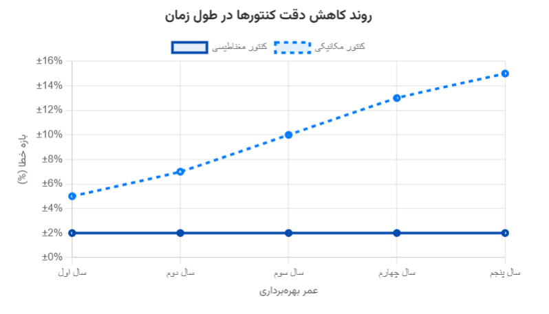 در چاههای پراملاح، دقت این کنتورها به سرعت افت میکند و منحنی خطا بهسختی قابل اصلاح است. این نمودار نشان میدهد که چگونه خطای یک کنتور مکانیکی میتواند طی چند سال افزایش یابد، در حالی که کنتور مغناطیسی دقت خود را حفظ میکند. این افت دقت به معنای ثبت نشدن میلیونها متر مکعب آب مصرفی و شکست طرحهای مدیریتی است.