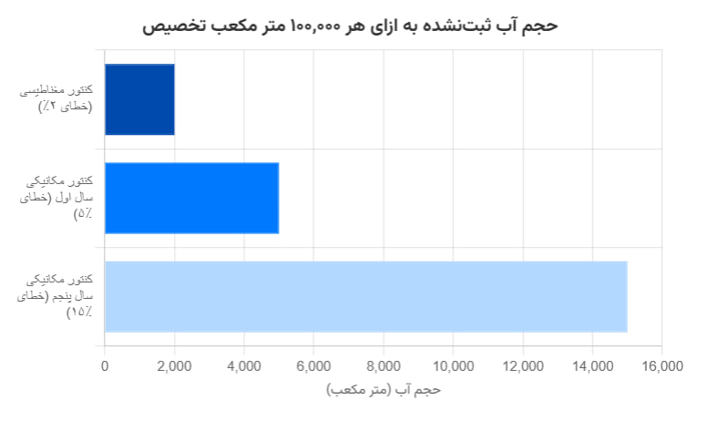 این نمودار نشان میدهد که حتی یک خطای کوچک در یک چاه، چگونه در مقیاس کشور به هدررفت عظیم منابع منجر میشود. خطای ۱۵ درصدی یک کنتور مکانیکی فرسوده، عملاً هرگونه تلاش برای کنترل مصرف را بیاثر میکند.